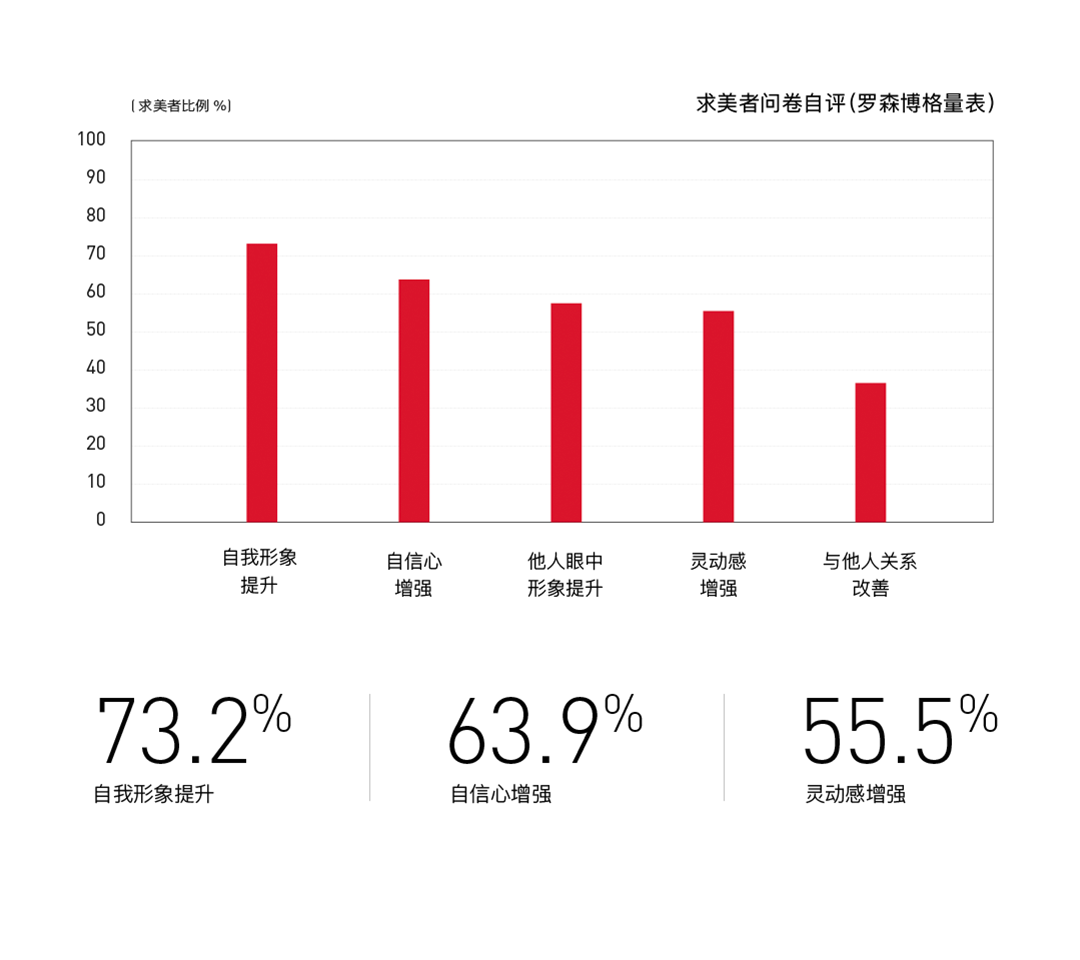 ART FILLER VOLUME艺术填充·致塑摆脱了传统工艺对交联剂的依赖,和同类型凝胶产品相比,化学交联度低(为6%),大大降低不良反应的发生率。根据消费者自我评价和GAIS评分,98.5%的用户表示ART FILLER VOLUME艺术填充·致塑的注射效果自然,罗森博格评分量表也反映出了高度的求美者满意度。